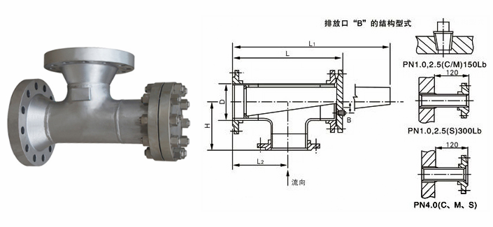 不銹鋼反折流式T型過(guò)濾器外形結(jié)構(gòu)圖:
