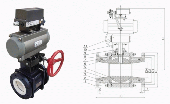 氣動(dòng)帶手動(dòng)陶瓷球閥外形結(jié)構(gòu)圖: