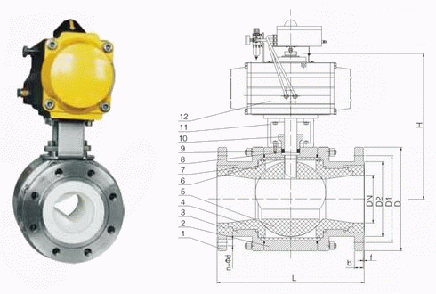陶瓷氣動V型調(diào)節(jié)球閥外形結(jié)構(gòu)圖: