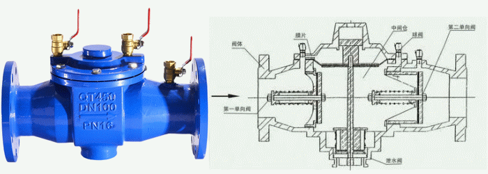 3、閥后管網(wǎng)水壓升高超過閥前進水端水壓時,如第二單向止回閥密封完好,水體不會倒流,此時泄水閥關(guān)閉不泄水,當(dāng)?shù)诙蜗蛑够亻y密封失靈產(chǎn)生滲漏時,泄水閥開啟排水泄壓。