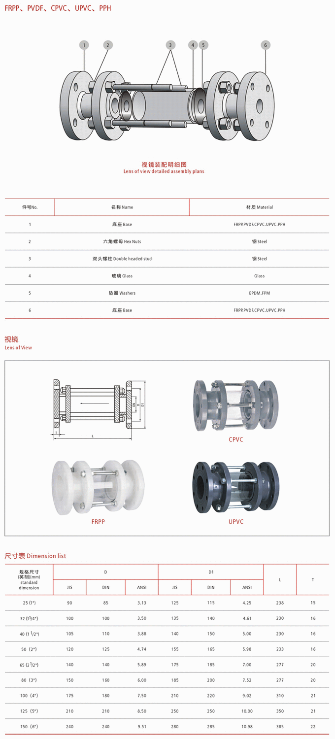 RPP,PPH,PVC塑料視鏡也叫做玻璃管視鏡或稱視盅,是安裝在管道或設(shè)備上可以隨時(shí)查看監(jiān)測(cè)內(nèi)部物料的工作情況。同時(shí)視鏡采用鋼化硼硅玻璃,聚乙烯四氟墊片,適用于大部分惡劣的工作環(huán)境中,并且使用壽命較長(zhǎng)。是工業(yè)管道裝置上主要附件之一,在石油、化工、醫(yī)藥、食品等工業(yè)生產(chǎn)裝置的管道中,視盅能隨時(shí)觀察管道中液體、氣體、蒸汽等介質(zhì)流動(dòng)及反應(yīng)情況,起到監(jiān)視生產(chǎn)、避免生產(chǎn)過(guò)程中事故發(fā)生的作用。視盅由于結(jié)構(gòu)緊湊,它安裝簡(jiǎn)單,使用方便,非常容易清洗與維修,是目前最常用的一種產(chǎn)品。