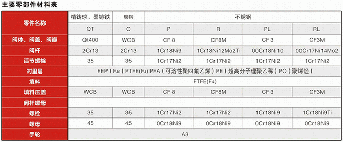 襯氟截止閥零件材料: