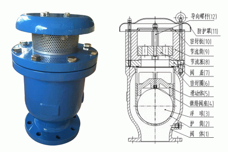 空氣閥有兩個(gè)圓柱形浮筒:大浮筒和小浮筒,分別負(fù)責(zé)低壓進(jìn)排氣與高壓微量排氣。小浮筒安裝在大浮筒的上方,且兩個(gè)浮筒均在主閥體內(nèi)空氣閥帶有緩沖盤片,確保平緩排氣,防止出現(xiàn)"氣堵"破壞的情況。緩沖片在經(jīng)歷高速排氣時(shí)所通過的面積以及小孔的數(shù)量可做調(diào)整。