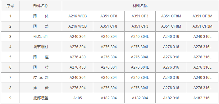 可調(diào)恒溫式疏水閥零件材料: