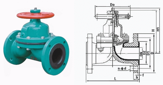 法蘭襯膠隔膜閥外形結(jié)構(gòu)圖: