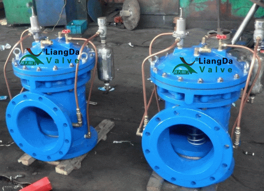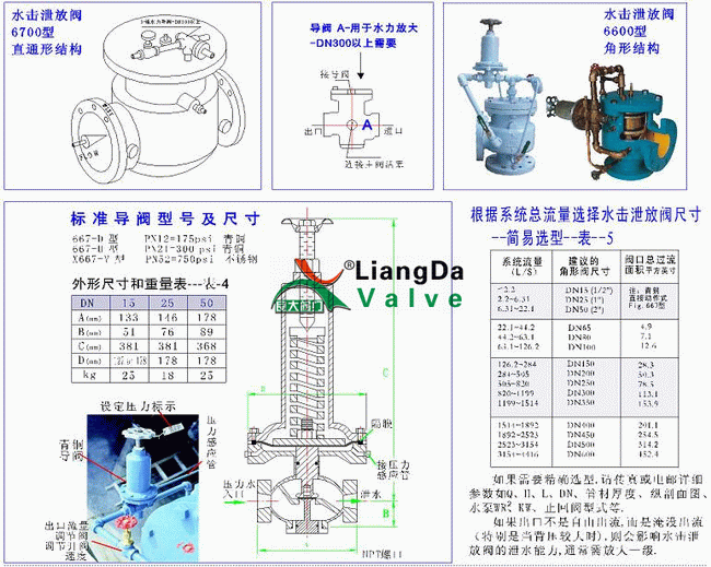 水擊泄放閥由主閥、高壓水力導(dǎo)閥、導(dǎo)管等零部件組成。具有水力自動控制、高壓無條件開啟泄除水錘的功能。主閥能快開緩閉,具有防止自身關(guān)閥水錘的功能。水擊泄放閥用于水泵出口管道主輸水管上,靠近水擊發(fā)生源如止回閥、輸水管超壓點等,用T型三通外接,能無條件泄除高壓水錘,是泵站安全后保護(hù)設(shè)備,能有效地提高系統(tǒng)安全可靠性。