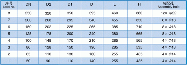 注:法蘭執(zhí)行標(biāo)準(zhǔn):GB2501-89,DN50-DN150公稱工作壓力0.6Mpa,