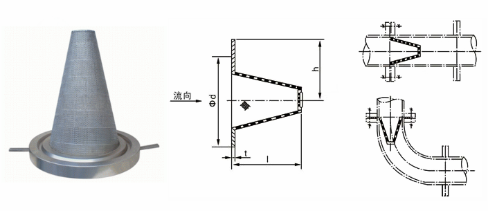 法蘭平頂錐形過濾器多作為管路系統(tǒng)竣工前試壓、清洗使用,具有結(jié)構(gòu)簡單,體積小,重量輕,拆裝清洗方便等特點(diǎn),既可設(shè)置在直管段,又可在90°彎頭處安裝,但需要配置可拆卸的短管。