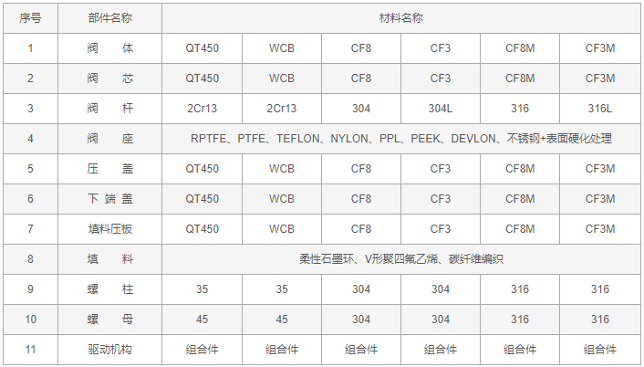 焊接偏心半球閥零件材料: