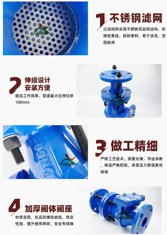 隔污閥分為兩種一種是不帶伸縮的隔污閥,另一種就是帶伸縮的隔污閥,表前隔污閥主要用于保護(hù)管道中水表計(jì)量元件不受固體雜質(zhì)的破壞,確保水表計(jì)量的正常運(yùn)行。表前隔污閥壓力損失小,流通能力大。采用不銹鋼緊固件濾芯,很大限度防銹。為避免雜物堆積太多,導(dǎo)致管道堵塞,用戶應(yīng)定期拆洗濾網(wǎng)。