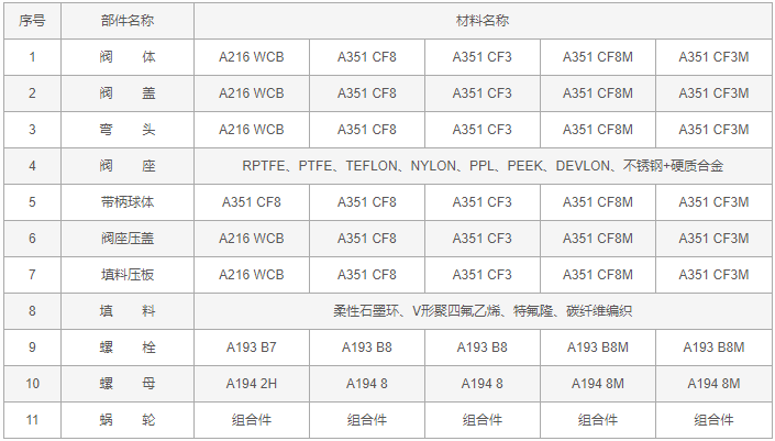 蝸輪Y型三通球閥零件材料:
