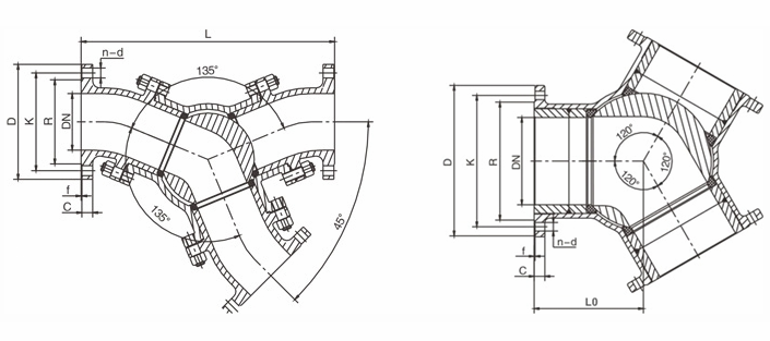 電動(dòng)Y型三通球閥的兩通孔之間被設(shè)計(jì)成120°或135°的夾角,其主要通過(guò)球體在120°或135°之間的旋轉(zhuǎn)改變介質(zhì)流向,所以它除了進(jìn)口A、出口B,還有換向口C,普通閥門是不具備改變介質(zhì)流向功能。其工作過(guò)程:閥門打開介質(zhì)從A進(jìn)入閥門,經(jīng)B流出閥門,當(dāng)旁路需要介質(zhì)流入時(shí),接通電源,電裝驅(qū)動(dòng)閥桿旋轉(zhuǎn)120°或135°,球體換向,介質(zhì)從A進(jìn)C出,當(dāng)旁路不需要介質(zhì)流入時(shí),電動(dòng)執(zhí)行機(jī)構(gòu)再轉(zhuǎn)回120°或135°,介質(zhì)流向改變。
