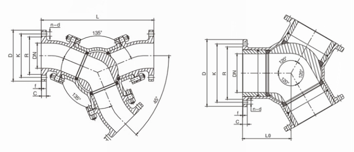 Y型三通粉體閥外形尺寸表: