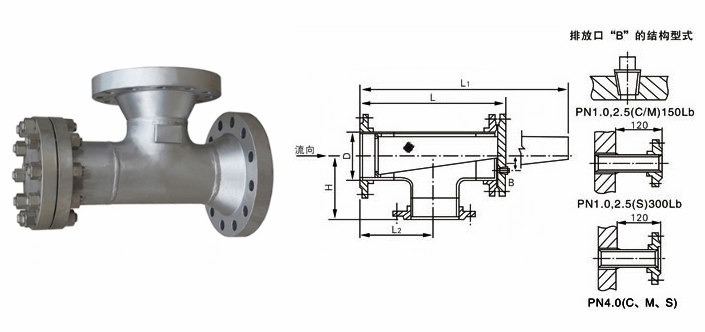 不銹鋼折流式T型過濾器外形結(jié)構圖: