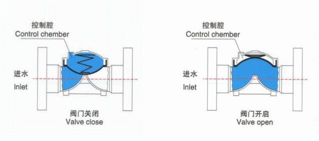 V型隔膜閥的關(guān)閉與開啟是通過來自管路的壓力作用于增強橡膠隔膜實現(xiàn)的。來水壓力直接通過密封隔膜開關(guān)閥門,隔膜上腔有壓時,隔膜切斷進水關(guān)閉閥門??刂魄恍箟簳r,利用來水壓力自動頂開隔膜打開閥門。閥門唯一活動部件為增強橡膠隔膜,在水通路上沒有閥軸、密封等,閥體采用PVC材料,可配合各種電磁閥、手動閥、減壓閥等實現(xiàn)各處控制功能。