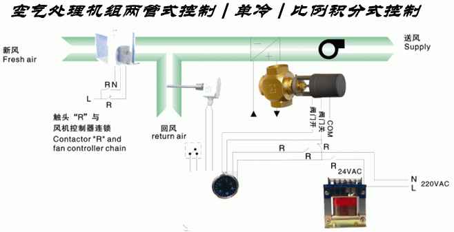 3、冬季制熱:當溫度傳感器檢測到室內(nèi)溫度低于溫度控制器設(shè)定的溫度時,電動調(diào)節(jié)閥開啟,流量增大,反之,當溫度傳感器檢測到的室內(nèi)溫度高于溫度控制器設(shè)定的溫度時,閥門關(guān)閉,流量減小。圖中R觸頭組可與風機連鎖,當風機啟動時新風風門打開,溫度控制器電源被接通,整個系統(tǒng)受控;當切斷風機電源時,風機停轉(zhuǎn),新風風門關(guān)閉。